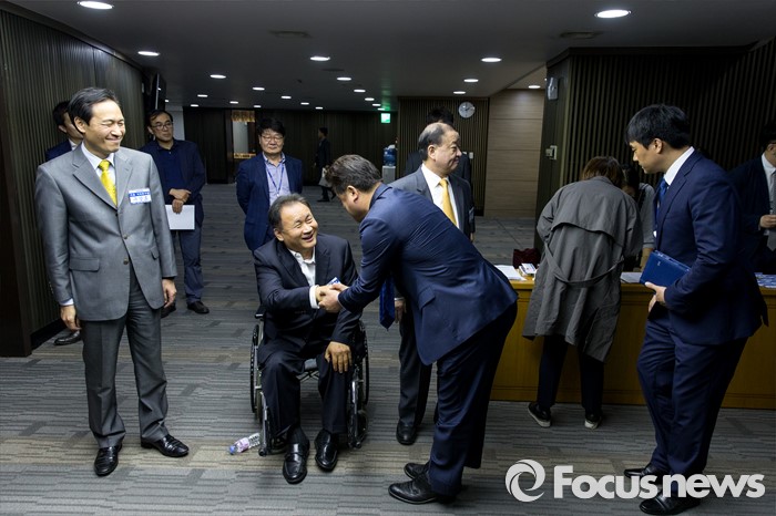 (서울=포커스뉴스) 더불어민주당 원내대표 경선에 출마한 우상호(왼쪽) 의원과 이상민(왼쪽 두 번째) 의원, 강창일 의원이 3일 오후 20대 국회의원 당선자 및 당무위원 연석회의가 개최된 서울 여의도 국회 예결위회의장 앞에서 당원들에게 한 표를 호소 하고 있다.