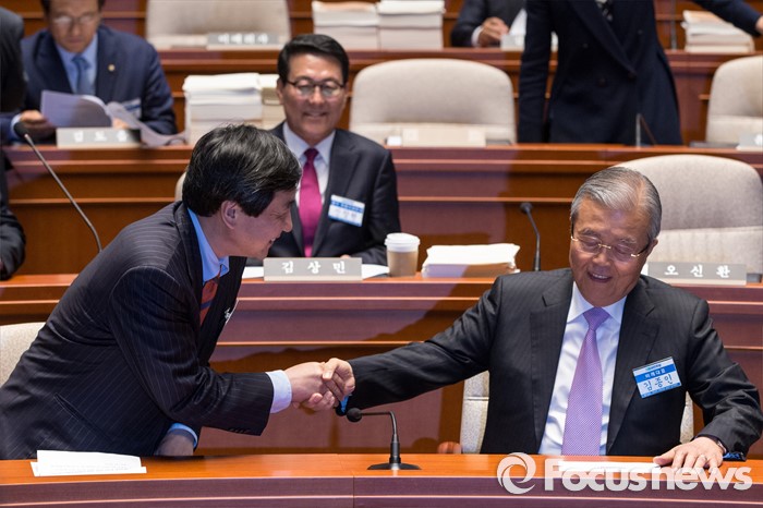 (서울=포커스뉴스) 김종인(오른쪽) 더불어민주당 비상대책위 대표와 이종걸 더불어민주당 원내대표가 3일 오후 서울 여의도 국회에서 열린 '20대 국회의원 당선자 및 당무위원 연석회의'에 참석해 악수 하고 있다.
