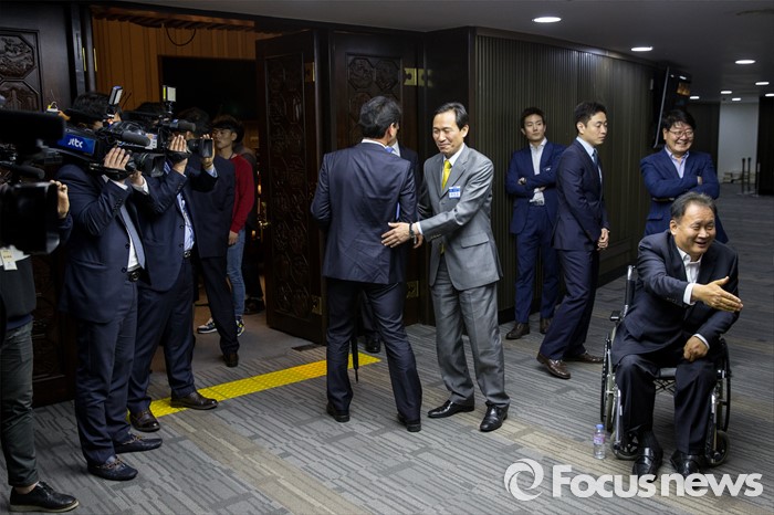 (서울=포커스뉴스) 더불어민주당 원내대표 경선에 출마한 우상호(오른쪽 두 번째) 의원과 이상민 의원이 3일 오후 20대 국회의원 당선자 및 당무위원 연석회의가 개최된 서울 여의도 국회 예결위회의장 앞에서 동료 의원 및 당선자들에게 한 표를 호소 하고 있다.