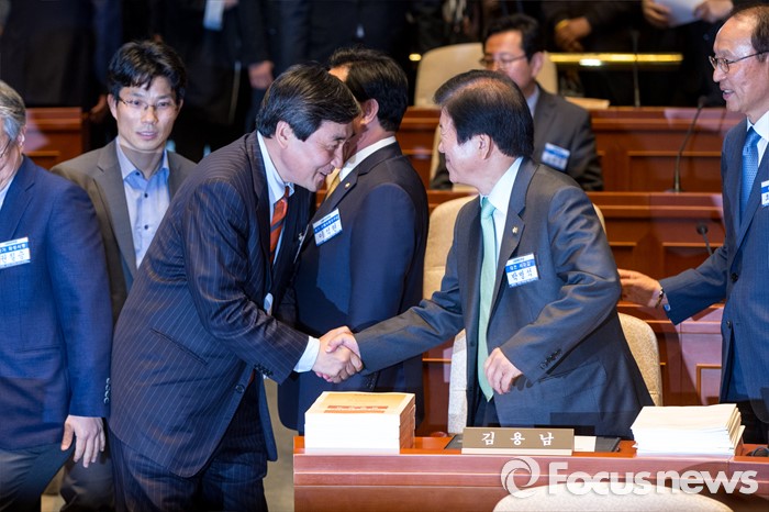 (서울=포커스뉴스) 이종걸 더불어민주당 원내대표가 3일 오후 서울 여의도 국회에서 열린 '20대 국회의원 당선자 및 당무위원 연석회의'에 참석해 당선자들과 악수 하고 있다.