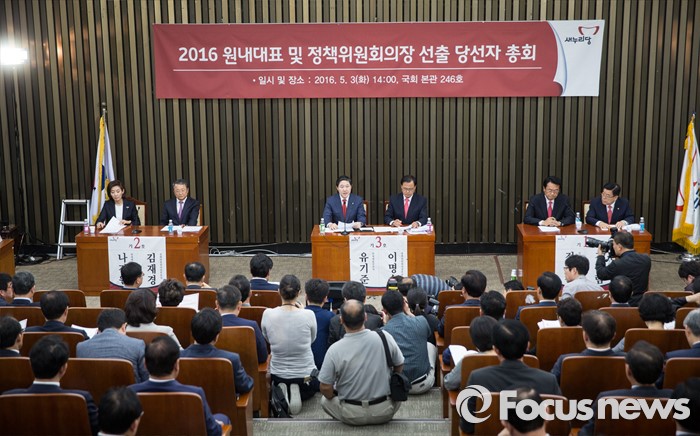 (서울=포커스뉴스) 정진석, 나경원, 유기준 원내대표 후보자 및 정책위의장 후보자들이 3일 오후 서울 여의도 국회에서 열린 새누리당 원내대표, 정책위의장 선출 및 당선자 총회에 참석하고 있다. 왼쪽부터 나경원 원내대표 후보자, 김재경 정책위의장 후보자, 유기준 원내대표 후보자, 이명수 정책위의장 후보자, 정진석 원내대표 후보자, 김광림 정책위의장 후보자
