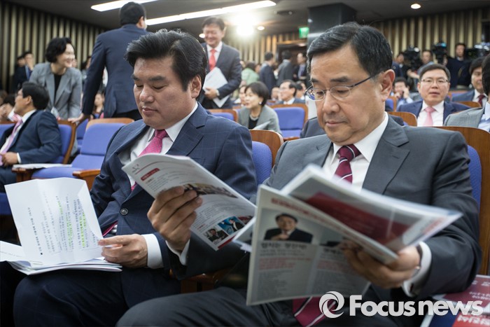 (서울=포커스뉴스) 원유철(왼쪽) 새누리당 대표최고위원 권한대행과 김정훈 정책위의장이 3일 오후 서울 여의도 국회에서 열린 새누리당 원내대표, 정책위의장 선출 및 당선자 총회에 참석해 후보자들의 홍보물을 보고 있다.