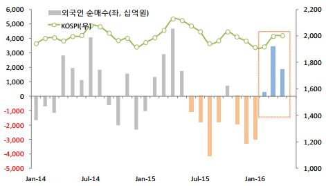 국내 증시에서 외국인 투자자는 2015년 11월~2016년 1월 중 8조1000억원을 순매도했으나 2월 이후 3개월 연속 순매수로 전환했다. 국내 유가증권시장에서 외인은 2월 중 3000억원, 3월 중 3조4000억원, 4월 1조9000억원을 순매수했다.