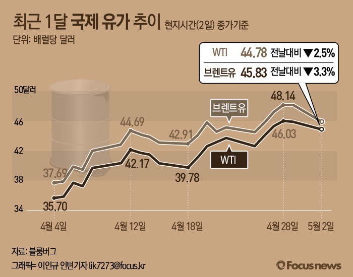 2일(현지시간) 뉴욕상업거래소에서 6월물 서부텍사스산 원유(WTI) 가격은 지난 주말보다 배럴당 2.5% 하락한 44.78달러를 기록했다.
