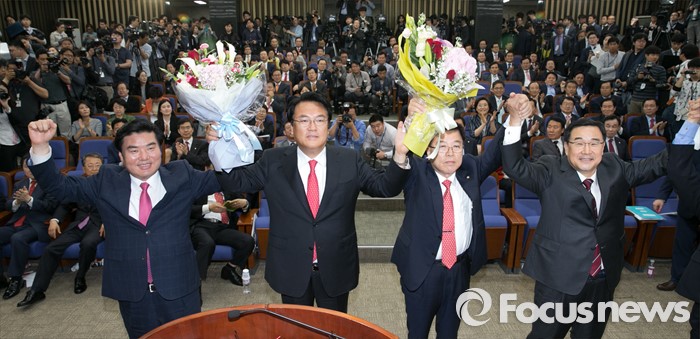 (서울=포커스뉴스) 3일 오후 서울 여의도 국회에서 열린 새누리당 20대 국회 첫 원내대표 및 정책위의장 선출을 위한 당선자 총회에서 선출된 신임 원내지도부와 현 지도부가 손을 들어 포즈를 취하고 있다. 왼쪽부터 원유철 대표최고위원 권한대행, 정진석 신임 원내대표, 김광림 신임 정책위의장, 김정훈 전 정책위의장.
