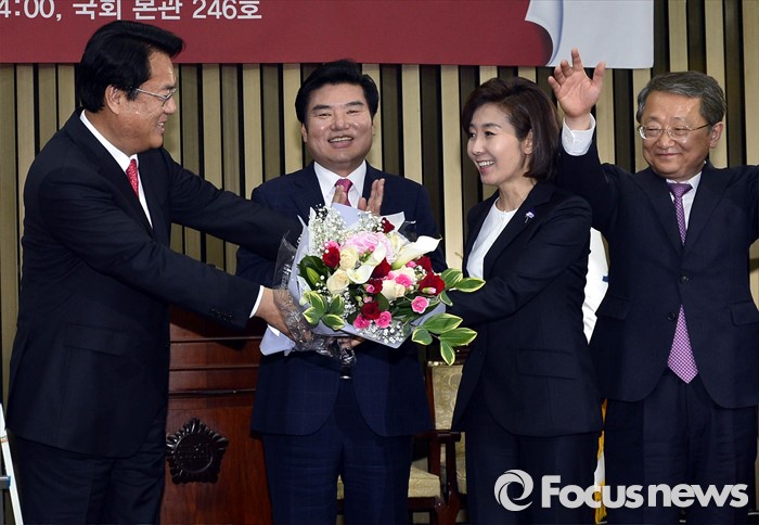 | △ 나경원 의원에게 꽃다발 전하는 정진석 |