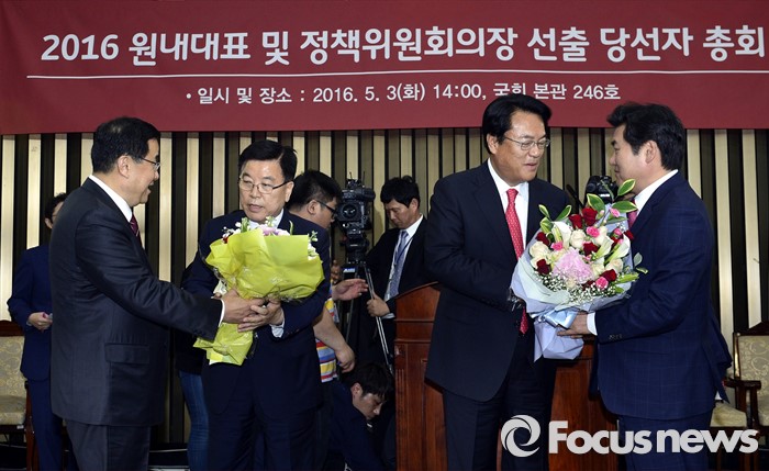 (서울=포커스뉴스) 3일 오후 서울 여의도 국회에서 열린 새누리당 20대 국회 첫 원내대표 및 정책위의장 선출을 위한 당선자 총회에서 선출된 정진석 신임 원내대표와 김광림 신임 정책위의장이 현 지도부로부터 축하의 꽃다발을 받고 있다. 오른쪽부터 원유철 대표최고위원 권한대행, 정 신임 원내대표, 김 신임 정책위의장, 김정훈 전 정책위의장.