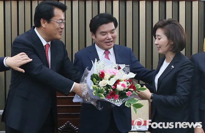 | △ 나경원에게 꽃다발 전하는 정진석 |