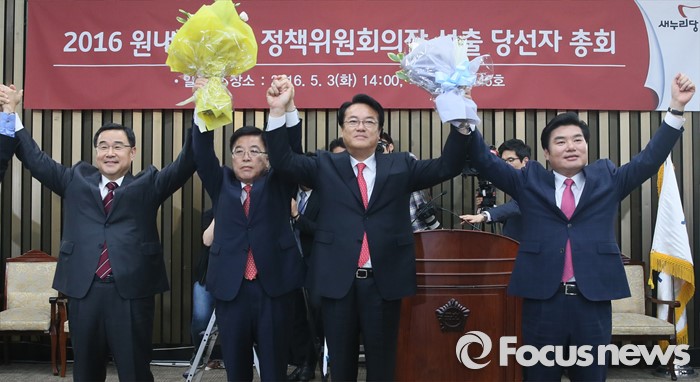 (서울=포커스뉴스) 3일 오후 서울 여의도 국회에서 열린 새누리당 20대 국회 첫 원내대표 및 정책위의장 선출을 위한 당선자 총회에서 선출된 신임 원내지도부와 현 지도부가 취재진을 향해 포즈를 취하고 있다. 오른쪽부터 원유철 대표최고위원 권한대행, 정진석 신임 원내대표, 김광림 신임 정책위의장, 김정훈 전 정책위의장.