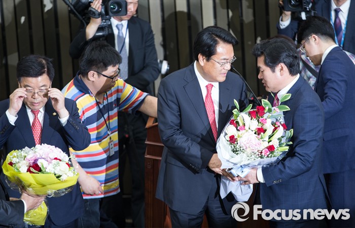 (서울=포커스뉴스) 3일 오후 서울 여의도 국회에서 열린 새누리당 20대 국회 첫 원내대표 및 정책위의장 선출을 위한 당선자 총회에서 원유철(오른쪽) 새누리당 대표최고위원 권한대행이 신임 원내대표로 선출된 정진석 후보에게 꽃다발을 전하고 있다.