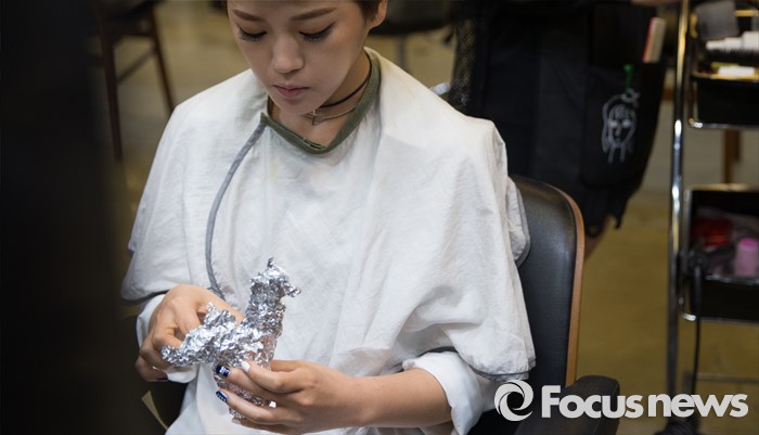 (서울=포커스뉴스) 3일 오후 서울 강남구 컬처앤네이처 청담점에서 걸그룹 솔티의 멤버 겨울이 머리손질을 하던 중 김밥을 먹고 있다. 솔티는 3일 오후 SBS MTV 생방송 더쇼를 통해 데뷔한 걸그룹 이다.