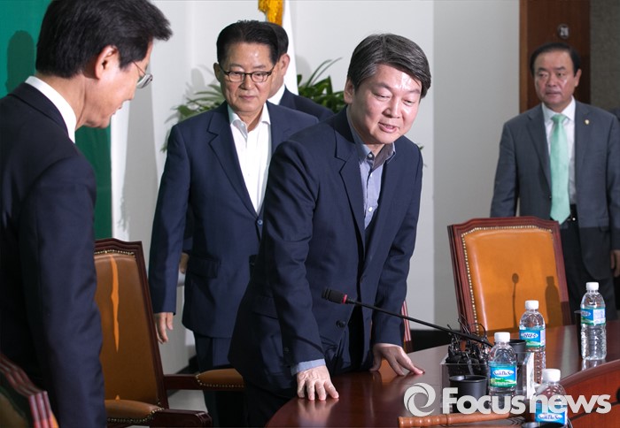 (서울=포커스뉴스) 안철수(왼쪽 세번째) 국민의당 상임공동대표와 천정배(왼쪽 첫번째) 공동대표, 박지원(왼쪽 두번째) 원내대표 등 지도부가 4일 오전 서울 여의도 국회에서 열린 최고위원회의에 참석하고 있다.