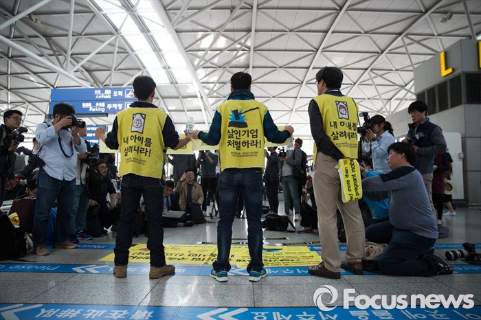 (인천공항=포커스뉴스) 4일 오전 인천국제공항 출국장에서 가습기 살균제 피해자 가족 모임과 환경보건시민센터 관계자들이 옥시레킷벤키저 영국 본사에 항의하기 위해 출국하기 전 기자회견을 하고 있다. 이들은 영국 런던에서 열리는 옥시레킷벤키저의 연례주주총회를 방문할 예정이다.