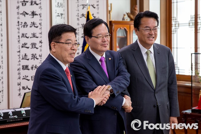 (서울=포커스뉴스) 정의화(가운데) 국회의장이 4일 오전 서울 여의도 국회에서 정진석(오른쪽) 새누리당 신임 원내대표와 김광림 새누리당 신임 정책위원장과 면담에 앞서 악수 하고 있다.