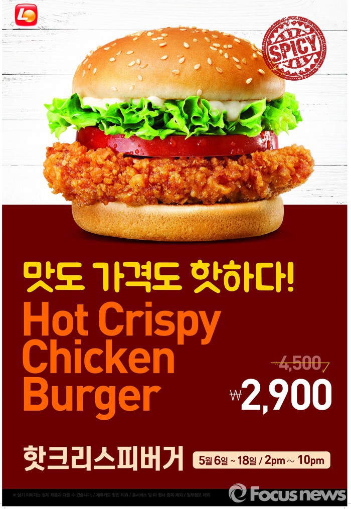 9일부터 18일까지는 오전 10시~오후 10시 사이에 핫크리스피버거를 정상가 4500원에서 약 33% 할인한 2900원에 판매한다.