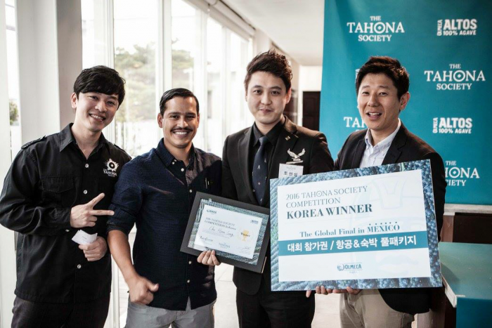 한편, 이번 대회에서 새로운 칵테일 레시피로 최종 우승한 조현성 바텐더는 오는 9월 멕시코 현지에서 열리는 '글로벌 타호나 소사이어티'에 한국 대표로 참가한다.'2016 올메카 타호나 소사이어티'에서 우승을 차지한 조현성 바텐더(오른쪽 2번째)가 기념촬영을 하고 있다.<사진제공=리츠칼튼 서울>