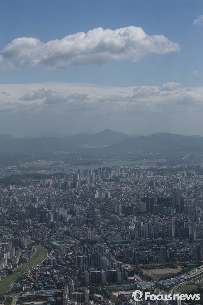 (서울=포커스뉴스) 여름이 시작됨을 알리는 입하(立夏) 절기를 하루 앞둔 4일 오전 서울 송파구 롯데타워에서 바라본 서울 도심에 파란하늘과 구름이 어우러져 있다.