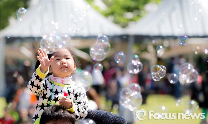 (서울=포커스뉴스) 어린이날을 하루 앞둔 4일 오전 서울 마포구 월드컵공원 난지잔디광장에서 2016 마포어린이축제에 참가한 어린이들이 버블쇼를 보며 즐거운 시간을 보내고 있다.