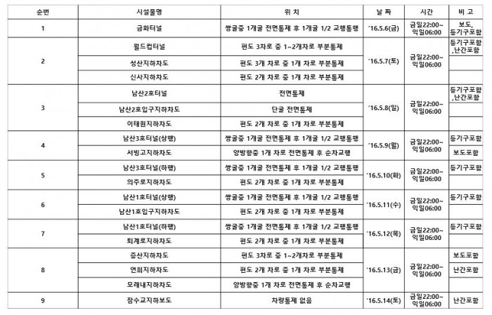 서부도로사업소 관계자는 "세척이 진행되는 야간시간 동안은 통행에 불편이 예상된다"며 "세척 중 해당 구간을 통행하는 차량은 서행이나 우회해 주실 것을 당부드린다"고 말했다.도로시설물 세척계획(5월) <표제공=서울시청>