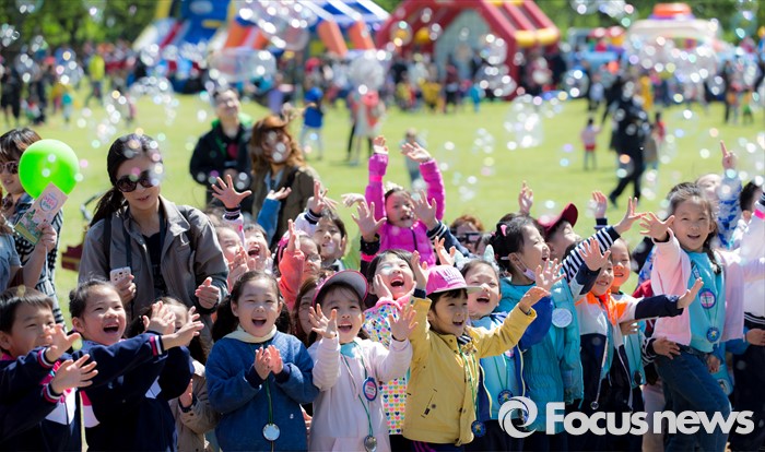 (서울=포커스뉴스) 어린이날을 하루 앞둔 4일 오전 서울 마포구 월드컵공원 난지잔디광장에서 2016 마포어린이축제에 참가한 어린이들이 버블쇼를 보며 즐거운 시간을 보내고 있다.