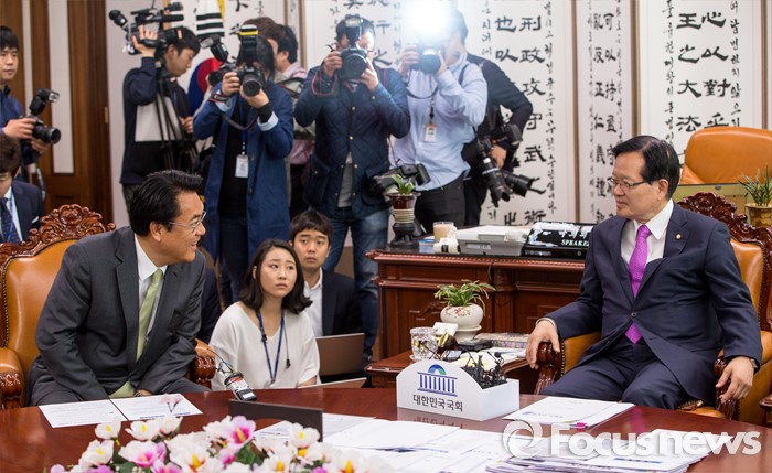 (서울=포커스뉴스) 정의화(오른쪽) 국회의장이 4일 오전 서울 여의도 국회에서 정진석 새누리당 신임 원내대표와 면담 하고 있다.