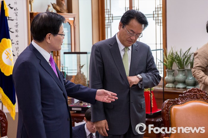(서울=포커스뉴스) 정의화(왼쪽) 국회의장이 4일 오전 서울 여의도 국회에서 정진석 새누리당 신임 원내대표와 면담에 앞서 자리 이동을 권유 하고 있다. 이날 정 의장은 여야 원내대표 면담 때 통상 본인 기준으로 왼쪽이 제1야당 원내대표 자리라고 밝혔다.