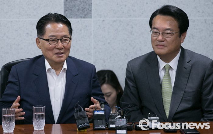 (서울=포커스뉴스) 정진석(오른쪽) 새누리당 신임 원내대표가 4일 오전 서울 여의도 국회 의원회관에서 박지원 국민의당 원내대표를 예방, 면담을 하고 있다.