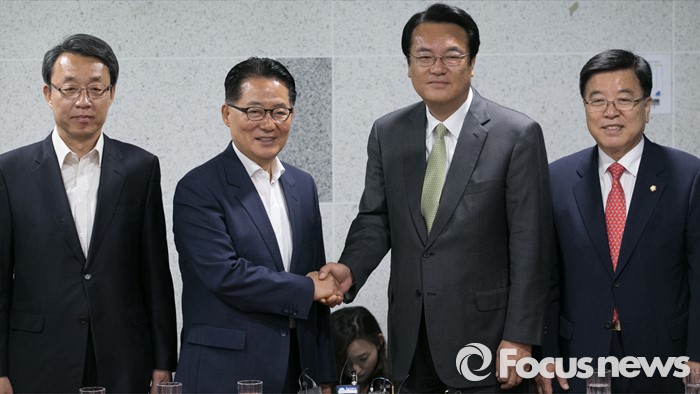 (서울=포커스뉴스) 새누리당 신임 원내지도부가 4일 오전 서울 여의도 국회 의원회관에서 국민의당 원내지도부를 예방, 취재진을 향해 포즈를 취하고 있다. 오른쪽부터 김광림 새누리당 신임 정책위의장, 정진석 신임 원내대표, 박지원 국민의당 원내대표, 김성식 정책위의장.