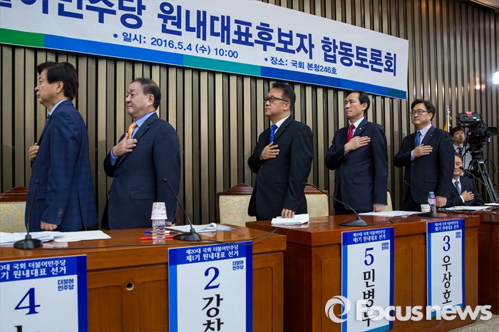 (서울=포커스뉴스) 4일 오전 서울 여의도 국회에서 열린 '원내대표 선거 합동 토론회'에서 후보들이 국민의례를 하고 있다. 왼쪽부터 노웅래 의원, 강창일 의원, 민병두 의원, 우상호 의원, 우원식 의원, 이상민 의원.