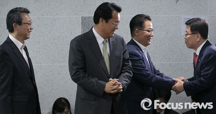 (서울=포커스뉴스) 새누리당 신임 원내지도부가 4일 오전 서울 여의도 국회 의원회관에서 국민의당 원내지도부를 예방, 인사하고 있다. 오른쪽부터 김광림 새누리당 신임 정책위의장, 박지원 국민의당 원내대표, 정진석 새누리당 신임 원내대표, 김성식 국민의당 정책위의장.