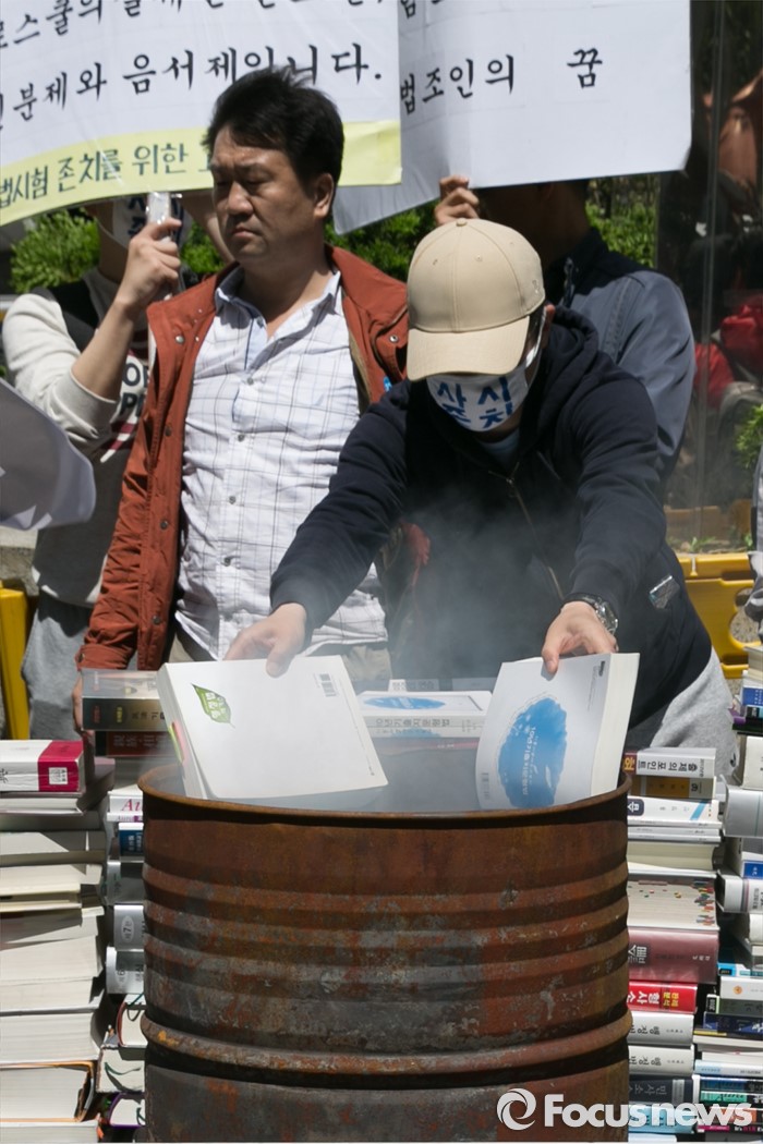 (서울=포커스뉴스) 사법시험 존치를 위한 고시생모임 회원들이 4일 오전 서울 여의도 더불어민주당사 앞에서 사시존치 법안을 19대 국회 임기내에 본회의에 상정할 것을 주장하며, 연막탄을 피운채 분서갱유 퍼포먼스를 하고 있다.