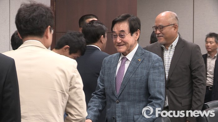 (서울=포커스뉴스) 현명관 한국마사회 회장이 4일 오전 경기도 과천 렛츠런파크 서울 대회의실에서 열린 '범 경마인 대표 자정 결의대회'에서 참석자들과 악수를 하고 있다. <사진=포커스뉴스 영상캡쳐>