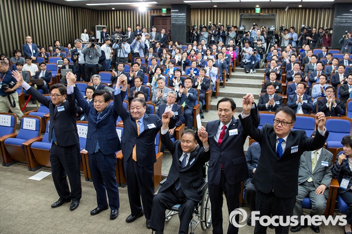 (서울=포커스뉴스) 4일 오후 서울 여의도 국회에서 열린 더불어민주당 원내대표 선거에서 후보들이 손을 맞잡고 사진촬영을 하고 있다. 왼쪽부터 우원식 후보, 노웅래 후보, 강창일 후보, 이상민 후보, 우상호 후보, 민병두 후보.