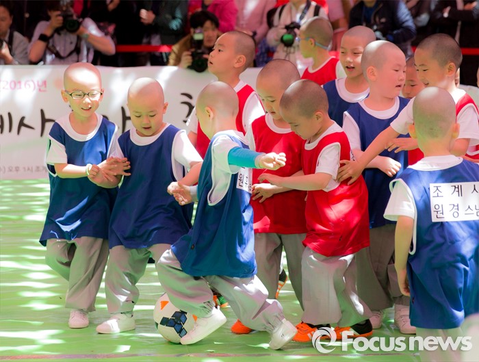 (서울=포커스뉴스) 4일 오후 서울 종로구 조계사 대웅전 앞에서 조계사와 홍법사 동자스님들이 축구대회에 참가해 실력을 겨루고 있다.