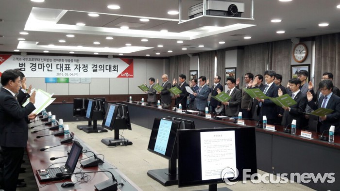 이날 결의대회에 참석한 경마 관계자들은 공정하고 투명한 경마시행과 신뢰 받는 경마문화 조성을 위해 노력하겠다는 내용을 담은 자정결의문을 소리 내 읽으며 각오를 다졌다.4일 오전 한국마사회는 경기도 과천시에 위치한 한국마사회 본관 2층 대회의실에서 '범 경마인 대표 자정 결의대회'를 개최했다. 결의대회 참석자들이 공정경마를 위한 자정결의문을 읽고 있다. 2016.5.4 김성훈 기자 shkim1222@focus.co.kr