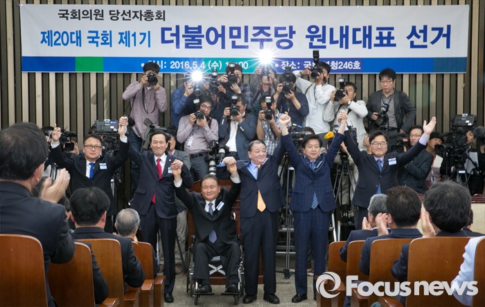 (서울=포커스뉴스) 4일 오후 서울 여의도 국회에서 열린 더불어민주당 20대 국회 1기 원내대표 선출을 위한 당선자 총회에 참석한 원내대표 후보들이 취재진을 향해 포즈를 취하고 있다. 왼쪽부터 민병두, 우상호, 이상민, 강창일, 노웅래, 우원식 후보.