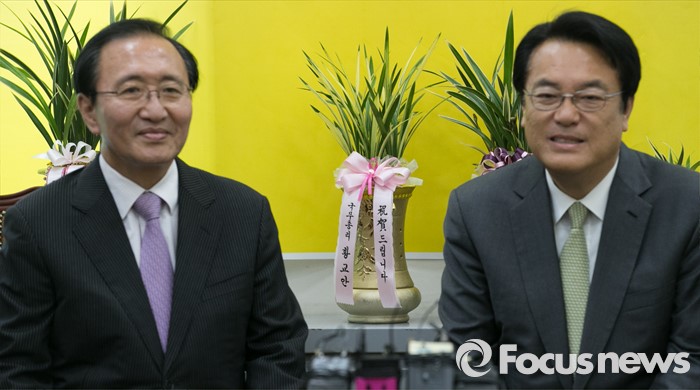 (서울=포커스뉴스) 정진석(오른쪽) 새누리당 신임 원내대표가 4일 오후 서울 여의도 국회에서 노회찬 정의당 원내대표를 예방, 면담을 하고 있는 모습 뒤로 황교안 국무총리가 노 원내대표에게 보낸 축하난이 보이고 있다.