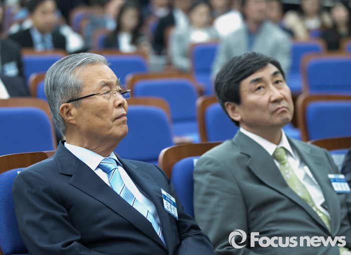 한편 이날 원내대표 선거에는 이상민·강창일·우상호·노웅래·민병두·우원식(기호순) 후보자가 출사표를 던졌다.(서울=포커스뉴스) 4일 오후 서울 여의도 국회에서 열린 더불어민주당 20대 국회 1기 원내대표 선출을 위한 당선자 총회에 참석한 김종인(왼쪽) 비대위 대표와 이종걸 원내대표가 선거를 기다리고 있다. 2016.05.04 박동욱 기자