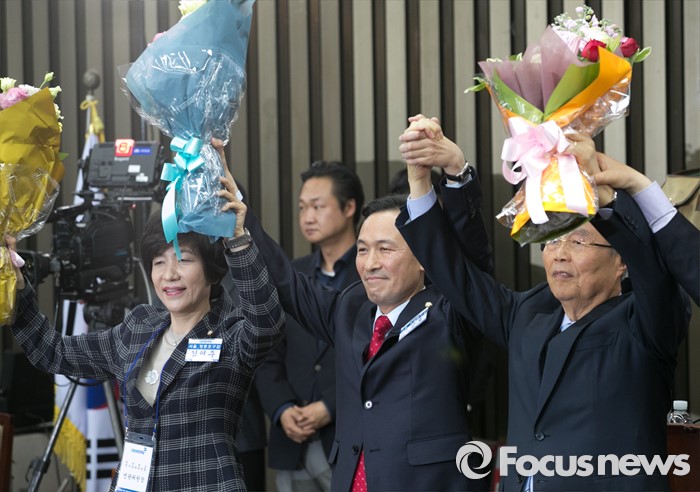(서울=포커스뉴스) 4일 오후 서울 여의도 국회에서 열린 더불어민주당 20대 국회 1기 원내대표 선출을 위한 당선자 총회에 참석한 김종인(오른쪽) 비대위 대표와 우상호(가운데) 신임 원내대표가 축하의 꽃다발을 들고 포즈를 취하고 있다. 왼쪽은 김영주 선거관리위원장.