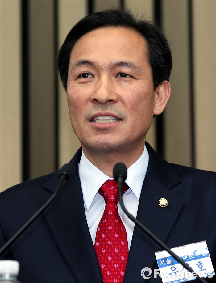 (서울=포커스뉴스) 4일 오후 서울 여의도 국회에서 더불어민주당 20대 국회 1기 원내대표 선출을 위한 당선자 총회에서 선출된 우상호 신임 원내대표가 소감을 전하고 있다.