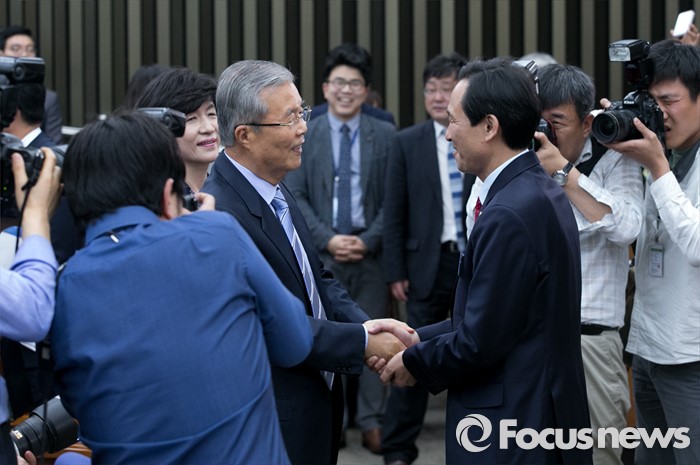 (서울=포커스뉴스) 4일 오후 서울 여의도 국회에서 더불어민주당 20대 국회 1기 원내대표 선출을 위한 당선자 총회를 마친 뒤 김종인(왼쪽) 비대위 대표와 우상호 신임 원내대표가 악수하고 있다.