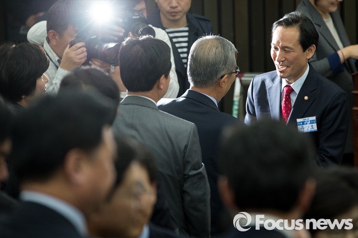 (서울=포커스뉴스) 우상호(오른쪽) 더불어민주당 의원이 4일 오후 서울 여의도 국회에서 열린 원내대표선거에서 신임 원내대표로 선출된 뒤 김종인 비상대책위 대표와 대화를 나누고 있다.