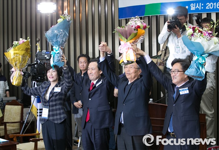 (서울=포커스뉴스) 4일 오후 서울 여의도 국회에서 열린 더불어민주당 20대 국회 1기 원내대표 선출을 위한 당선자 총회에 참석한 김종인 비대위 대표와 우상호 신임 원내대표가 축하의 꽃다발을 들고 포즈를 취하고 있다. 왼쪽부터 김영주 선거관리위원장, 우 신임 원내대표, 김 대표, 경쟁 후보였던 우원식 의원.