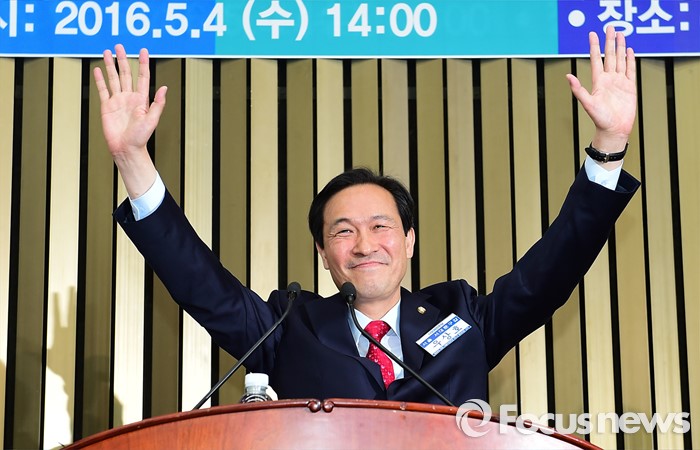 (서울=포커스뉴스) 4일 오후 서울 여의도 국회에서 더불어민주당 20대 국회 1기 원내대표 선출을 위한 당선자 총회에서 선출된 우상호 신임 원내대표가 소감을 전한 뒤 손을 들어 인사하고 있다.