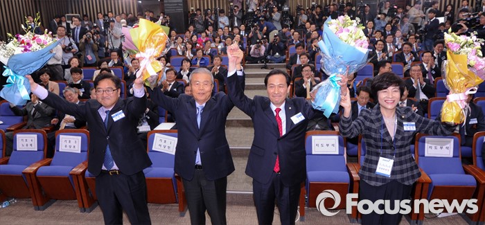 (서울=포커스뉴스) 4일 오후 서울 여의도 국회에서 더불어민주당 20대 국회 1기 원내대표 선출을 위한 당선자 총회에 참석한 김종인 비대위 대표와 우상호 신임 원내대표가 취재진을 향해 포즈를 취하고 있다. 왼쪽부터 경쟁 후보였던 우원식 의원, 김 대표, 우 신임 원내대표, 김영주 선거관리위원장.