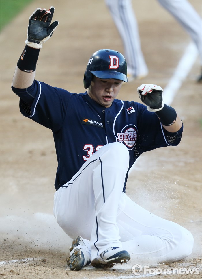 (서울=포커스뉴스) 4일 서울 잠실구장에서 열린 2016 프로야구 두산-LG 경기 2회초 1사 1,2루에서 두산 최재훈의 우전 안타때 2루주자 김재환이 홈에서 슬라이딩하며 득점하고 있다.