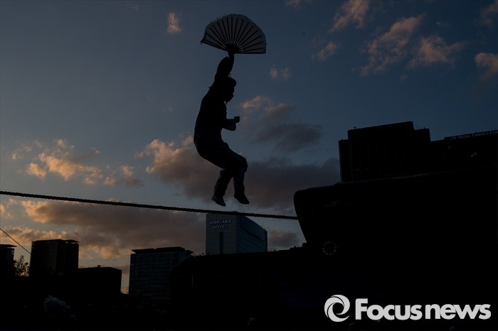(서울=포커스뉴스) 4일 오후 서울시청 광장에서 열린 '광대 줄타기 연희 한마당'에서 솟대쟁이패 단원들이 줄타기 공연을 하고 있다.