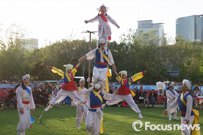 (서울=포커스뉴스) 4일 오후 서울시청 광장에서 열린 '광대 줄타기 연희 한마당'에서 솟대쟁이패 단원들이 멋진 공연을 하고 있다.