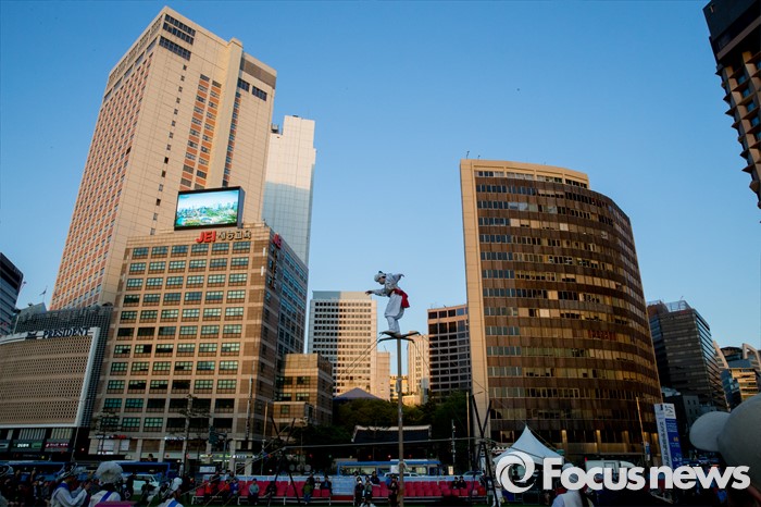 (서울=포커스뉴스) 4일 오후 서울시청 광장에서 열린 '광대 줄타기 연희 한마당'에서 솟대쟁이패 단원들이 멋진 공연을 하고 있다.