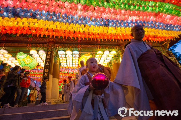 (서울=포커스뉴스) 조계사 스님과 동자승들이 4일 오후 서울 종로구 조계사에서 열린 연등 점등식이 끝나고 거리 행진을 하고 있다.